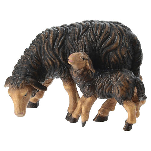 Oveja negra comiendo con cordero 9,5 cm belén Mahlknecht madera pintada Val Gardena