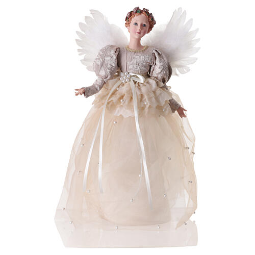 Punta decorativa para árbol con estructura cónica y revestimiento de tela. El ángel lleva un traje claro de tejido con aplicaciones ornamentales y alas laterales que aumentan el volumen de la figura, creando una presencia destacada en la cima del árbol.