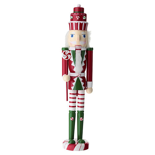 Cascanueces navideño de madera de 60x10 cm con piruleta decorativa y uniforme rojo, blanco y verde y sombrero decorado con motivos de dulces navideños.