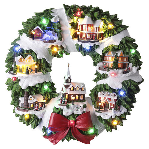 Corona navideña decorativa con iluminación integrada, ramas verdes, lazo rojo en la parte inferior y composición de pequeñas casas nevadas con figuras.