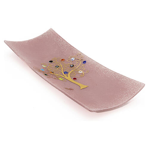 Vaciabolsillos de vidrio rosa de 5x15x30 cm decorado con Árbol de la Vida de oro puro y murrinas de vidrio de Murano aplicadas a mano.