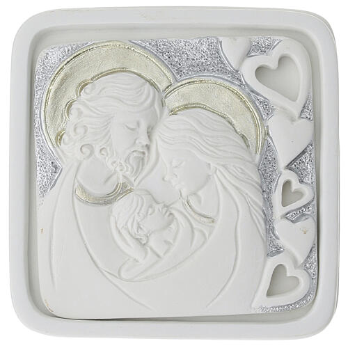Estructura cuadrada con tapa moldeada y panel superior decorado con la Sagrada Familia y motivos laterales de corazones.