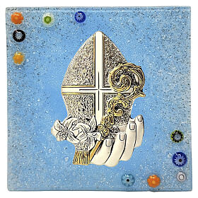 Cuadrito Confirmación vidrio de Murano azul con báculo y mitra