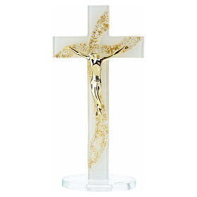 Cruz de vidrio de Murano con decoraciones doradas y base de apoyo 20 x 10 cm