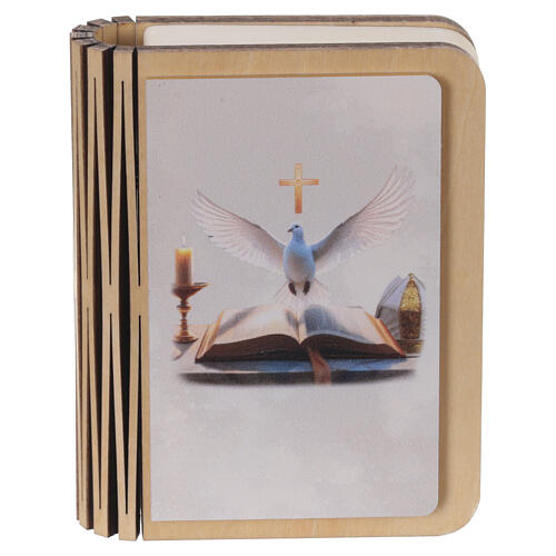 Recuerdo de la Confirmación en forma de libro con luz LED recargable y decorado con paloma, mitra y Evangelio.