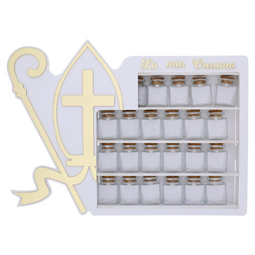 Set para la Confirmación compuesto por un mueble expositor y 24 frascos de vidrio con tapón de corcho.