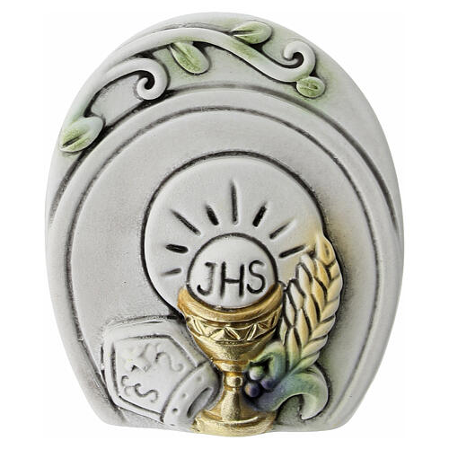 Imán para la Primera Comunión con decoración que representa símbolos eucarísticos: cáliz, espiga de trigo y sigla JHS.