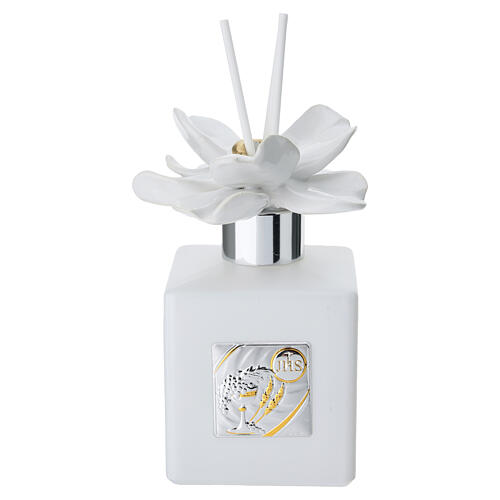 Perfumador de 200 ml pensado como recuerdo para la Primera Comunión, con una placa decorativa de bilaminado con símbolos eucarísticos.