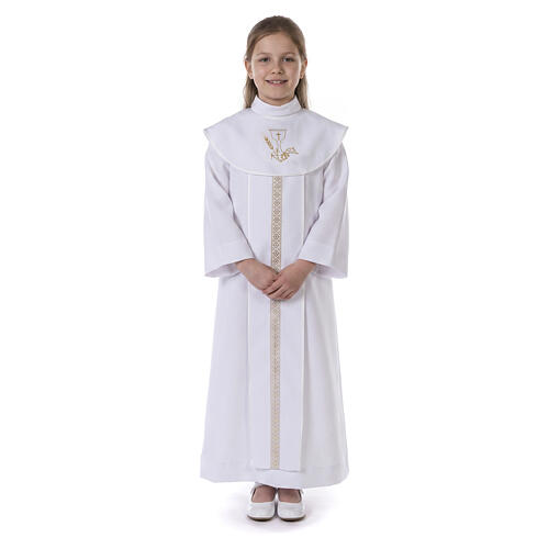 Esta túnica para la primera comunión es realizada íntegramente en Italia, sólo con materiales de origen italiano. La túnica para la Primera Comunión es de color blanco, es un modelo simple y sofisticado, posee una estola bordada con los símbolos eucarísticos, tiene además una aplicación de un encaje bordado en dorado en la parte delantera.