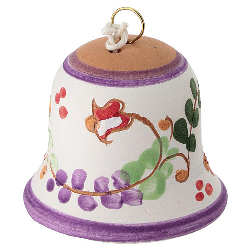 Campanilla de terracota esmaltada con decoración floral de color lila, rojo y verde, pintada a mano y realizada en Italia según técnicas artesanales tradicionales.
