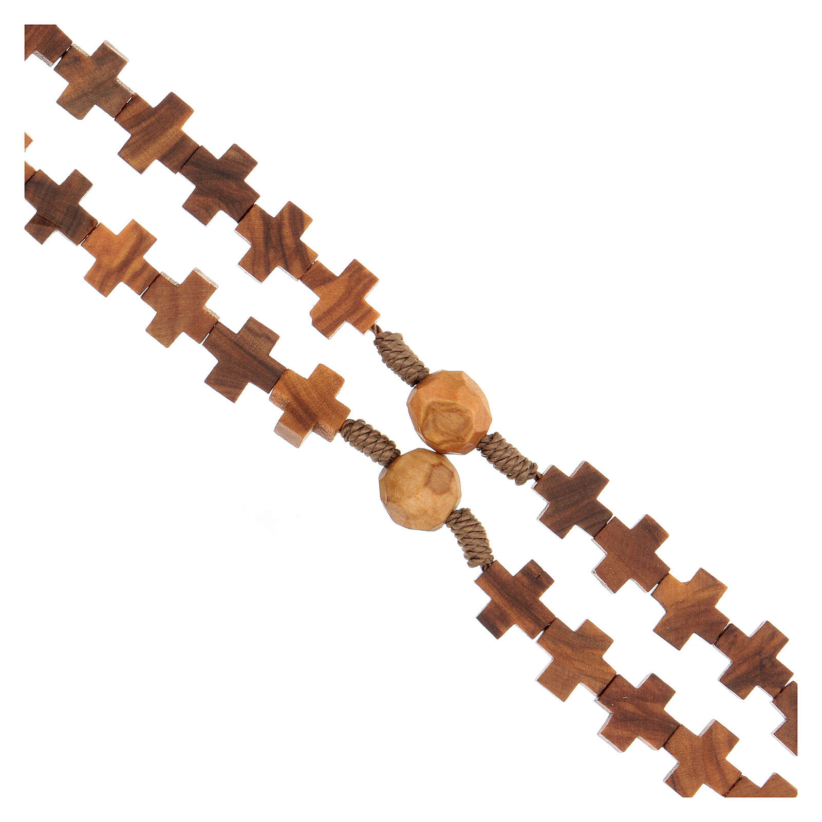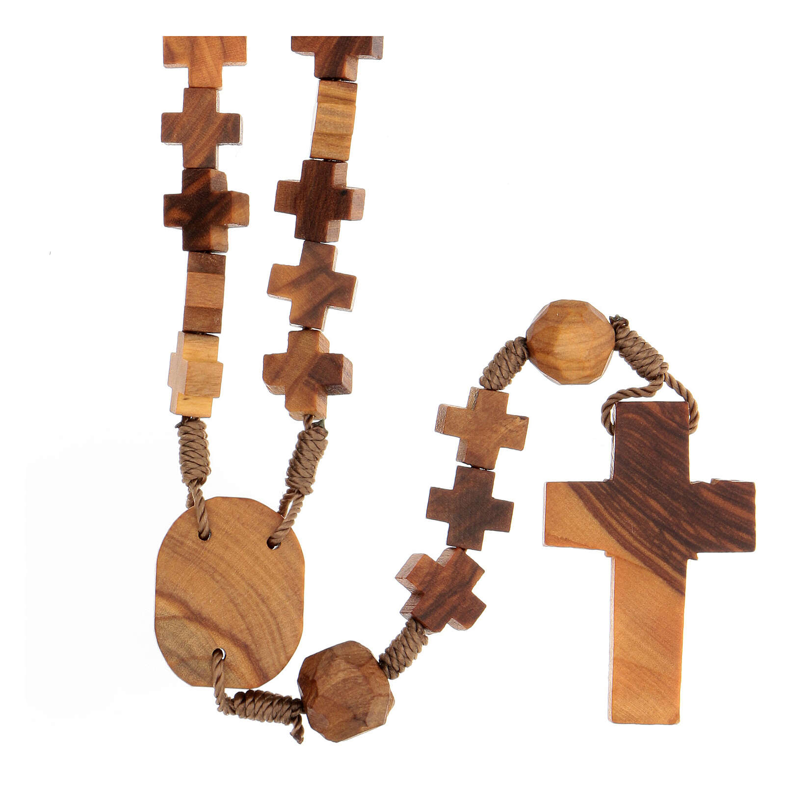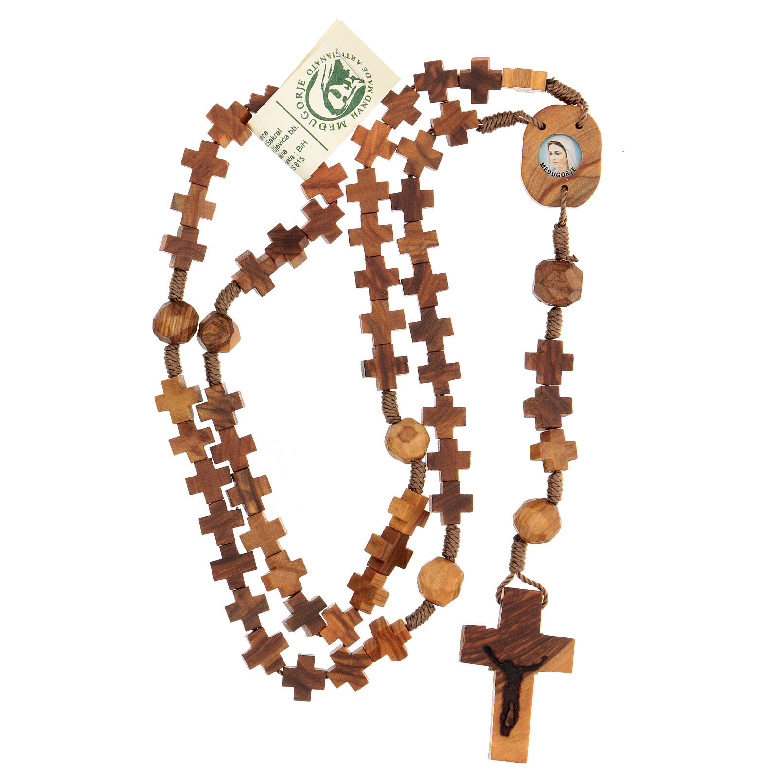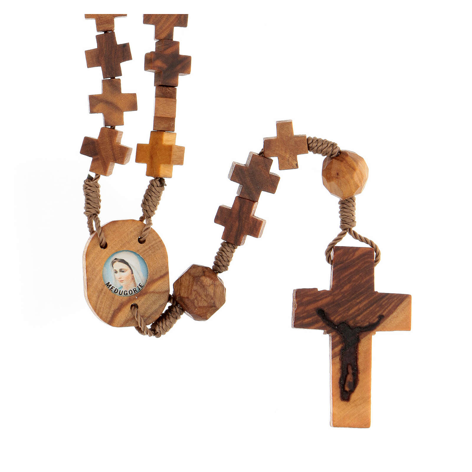 Rosario de cuerda marrón con granos de madera de olivo en forma de cruz de 1x1 cm, cruce de madera con la Virgen de Medjugorje y cruz de madera con la imagen incisa de Jesús.Rosario que se puede llevar de 60 cm de circunferencia realizado a mano por los artesanos de Medjugorje, por eso casa pieza es única y original.