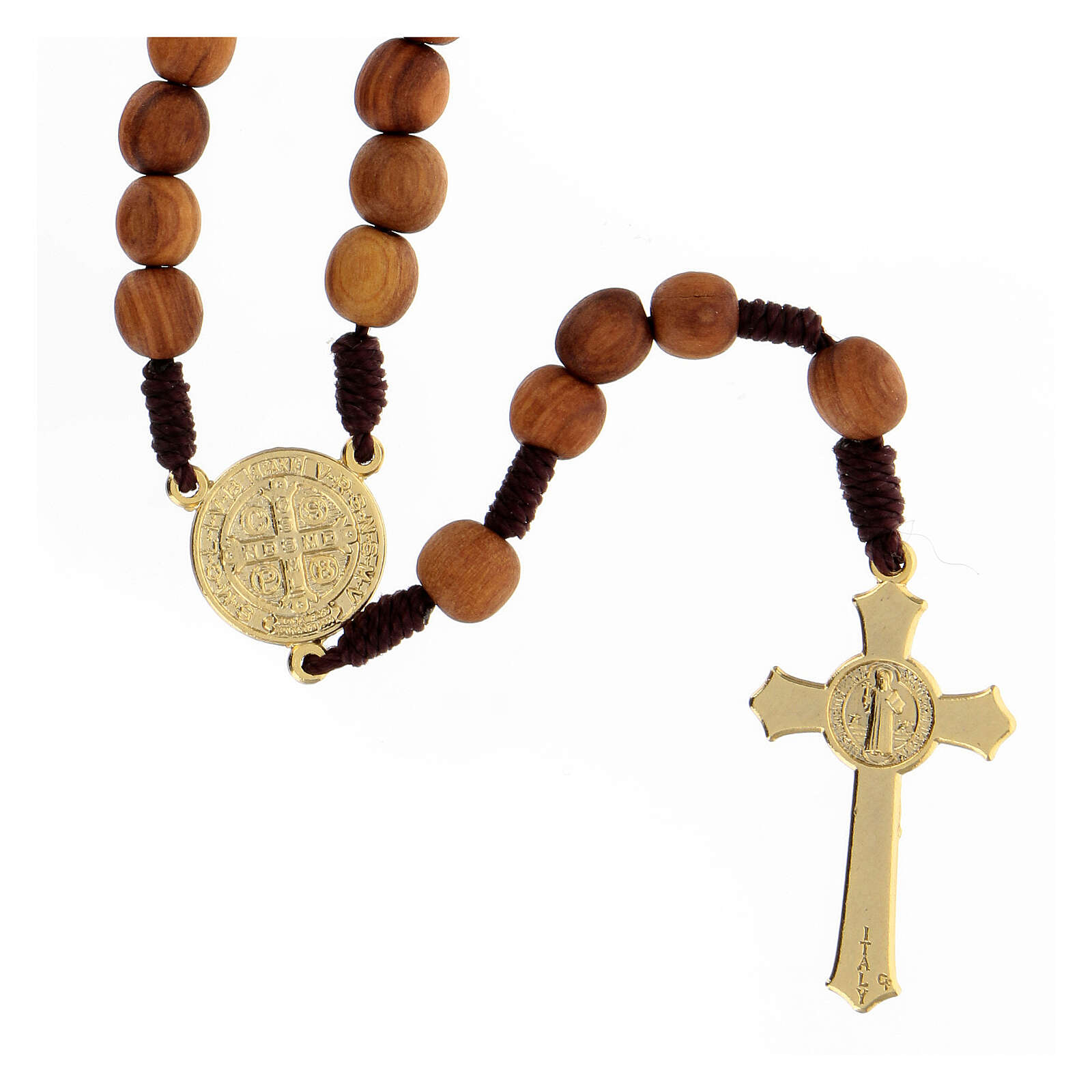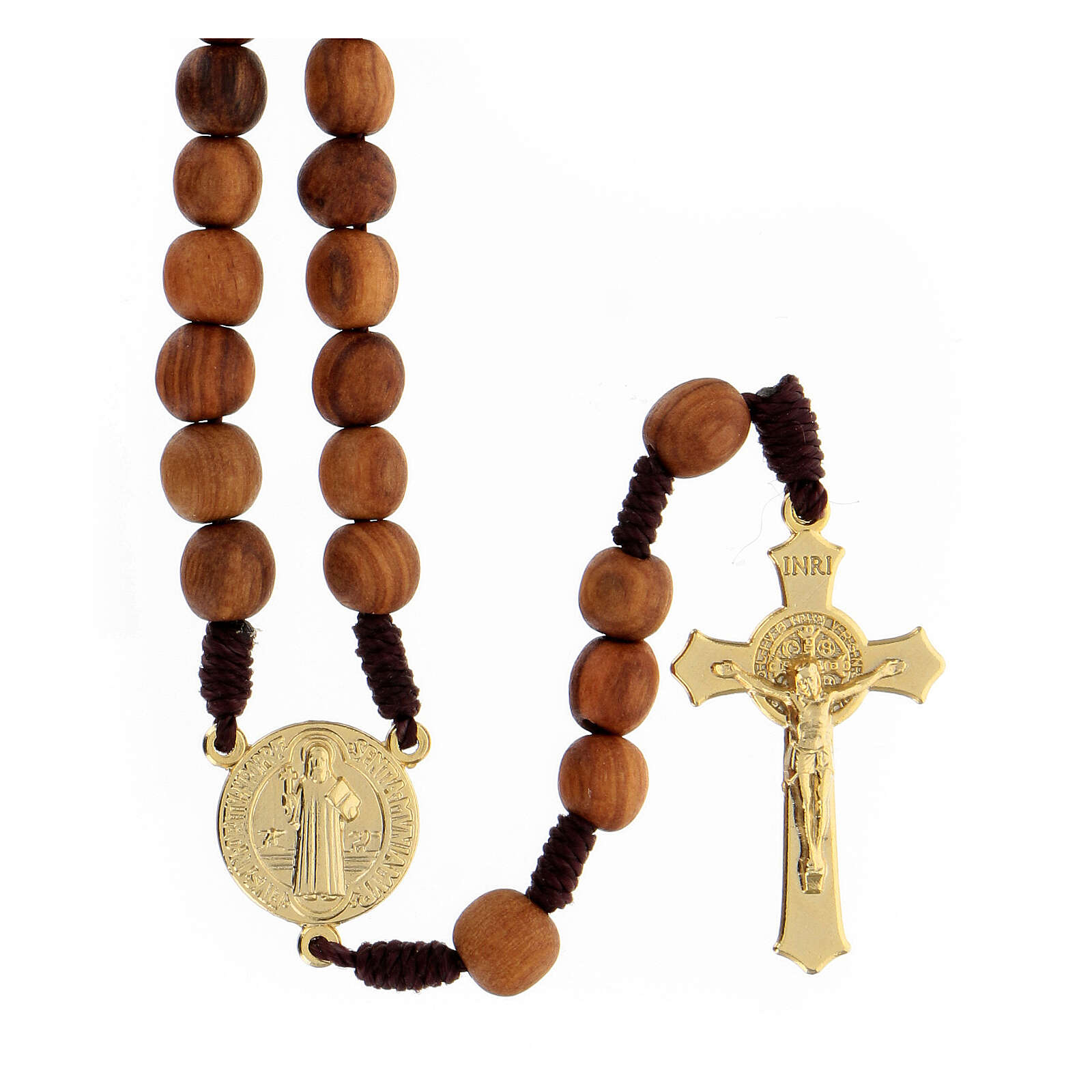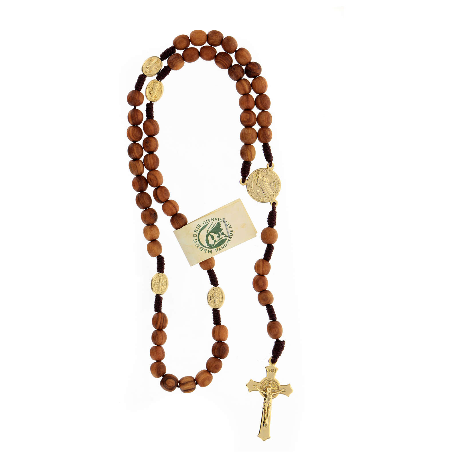 Rosario con granos de madera de olivo de 7 mm, cruce y cruz de metal dorado de San Benito.Rosario que no se puede llevar de 50 cm de circunferencia realizado a mano por los artesanos de Medjugorje, por eso casa pieza es única y original.