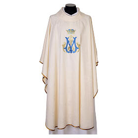 Casulla tejido adamascado marfil Mariana bordado oro y azul